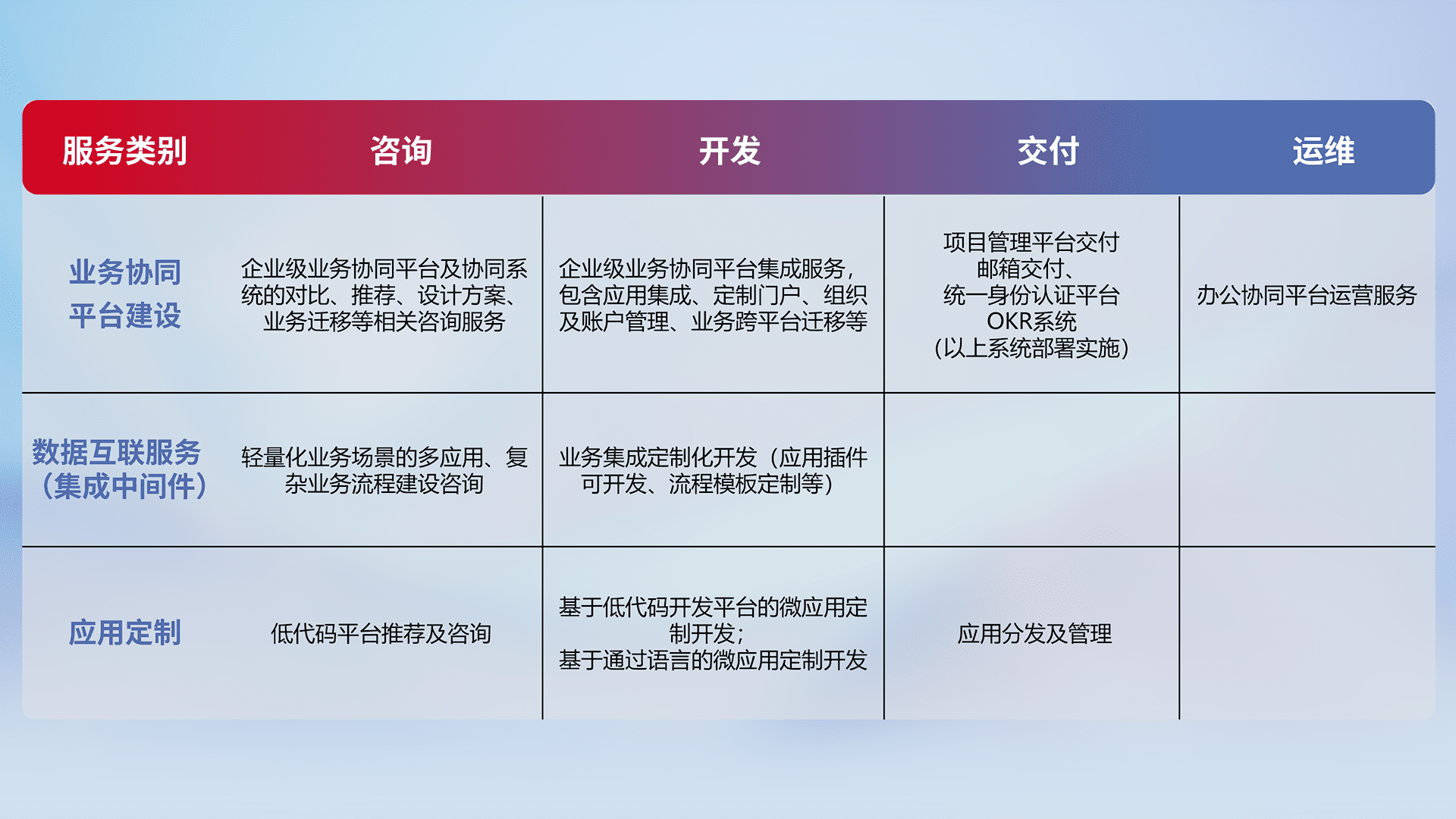 针对钉钉、、、、企微、、IDaas等平台级产品提供产品的规划、、、、方案、、、、交付、、、、定制化开发等服务,,,,实现如统一协同办公、、、、智能客户服务、、混合会议管理、、、智能数据查询、、、、等业务场景,,,,实现数字化转型。。。。