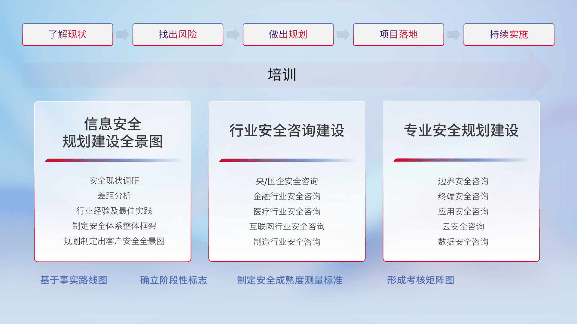 梳理客户信息安全现状调研、、、差距分析结果,,结合行业先进经验及最佳实践,,制订客户的信息安全管控体系总结架构,,,,最终形成一个完整的客户信息安全规划与建设的全景图。。